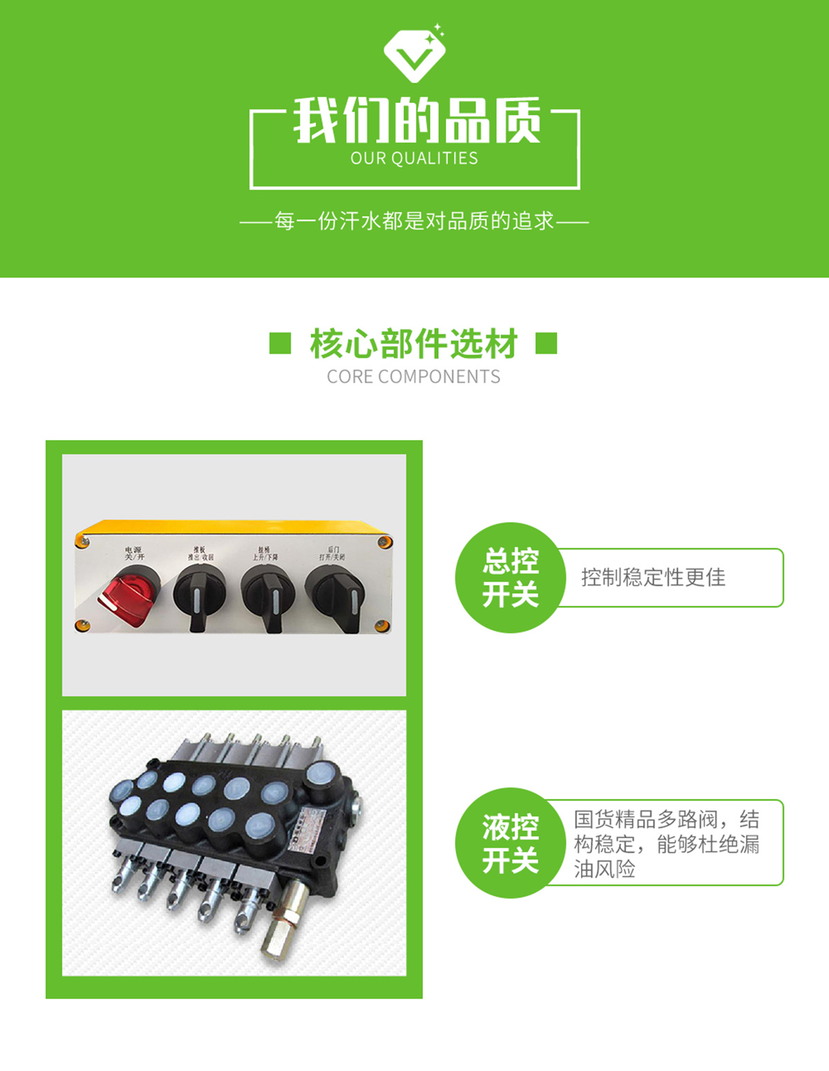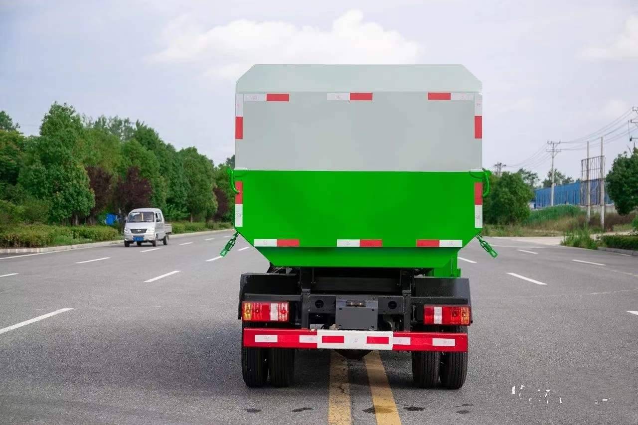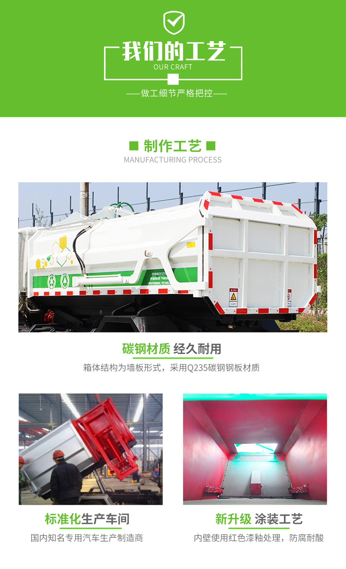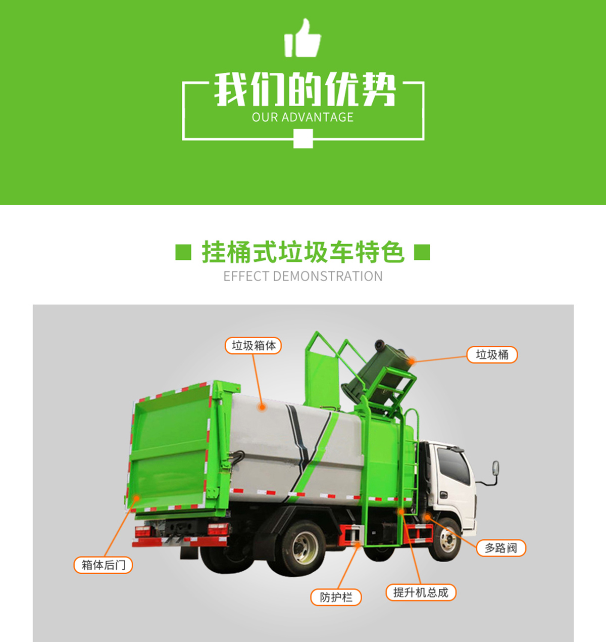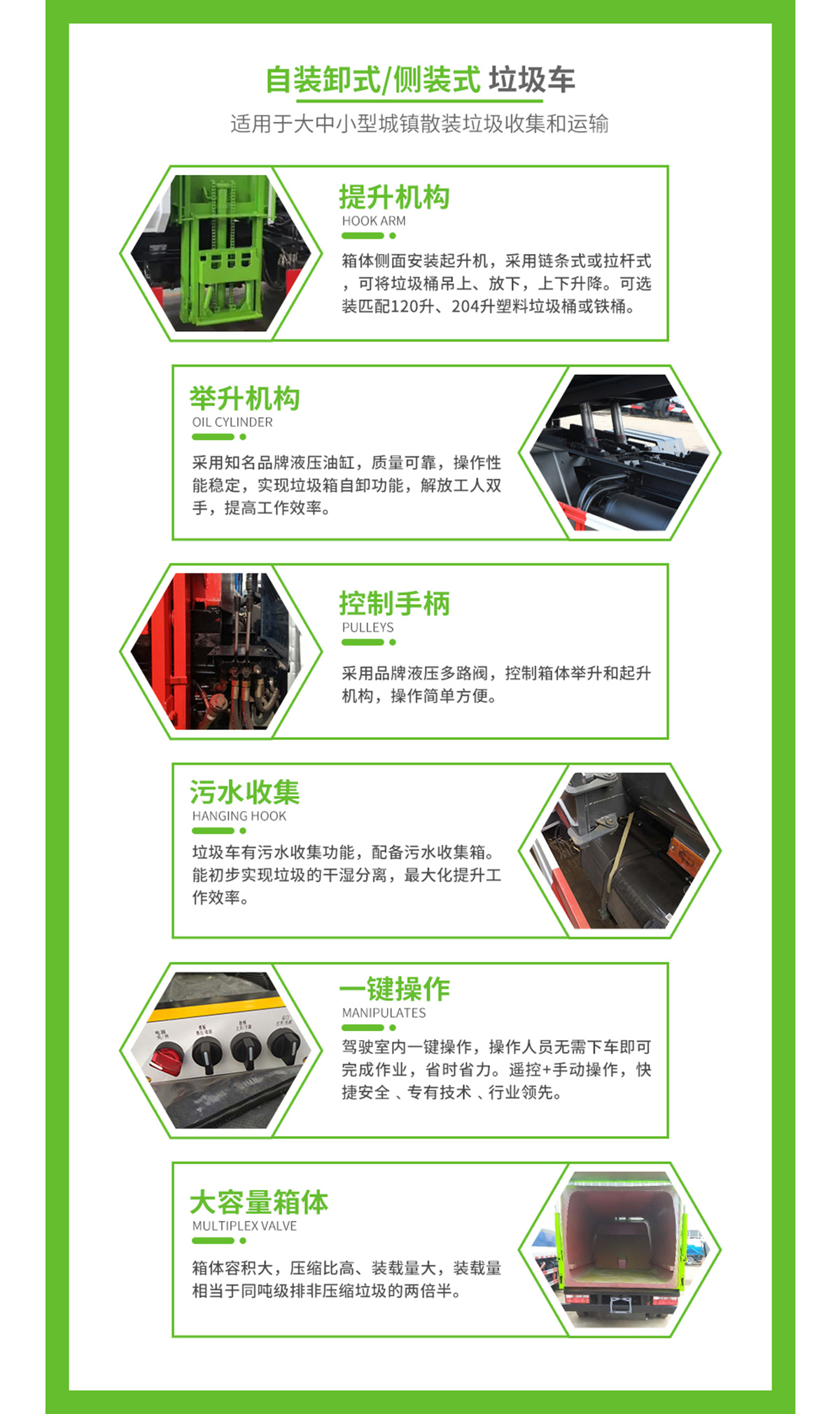 自動(dòng)舉升垃圾桶倒入垃圾,提升機(jī)頂部帶機(jī)械翻蓋,箱體底部雙液壓舉升自卸,箱體后部設(shè)有擋水槽,尾部裝有橡膠密封條,防污水滴漏。 |