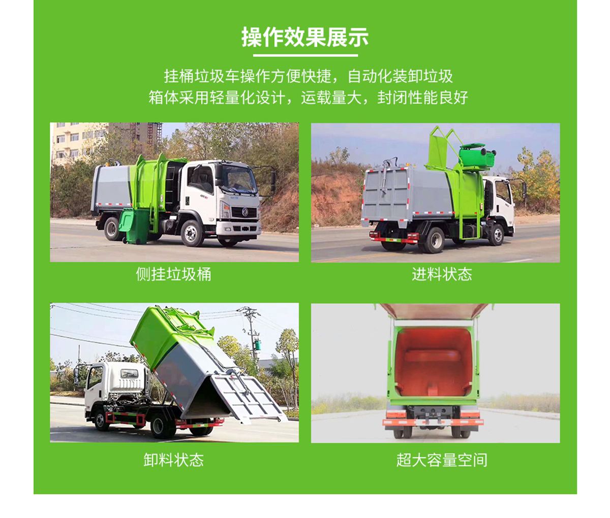 通過副駕一側(cè)的提升機(jī),將240L塑料垃圾桶垃圾提升至垃圾收集口,實(shí)現(xiàn)對垃圾的裝載及卸料作業(yè)功能; |