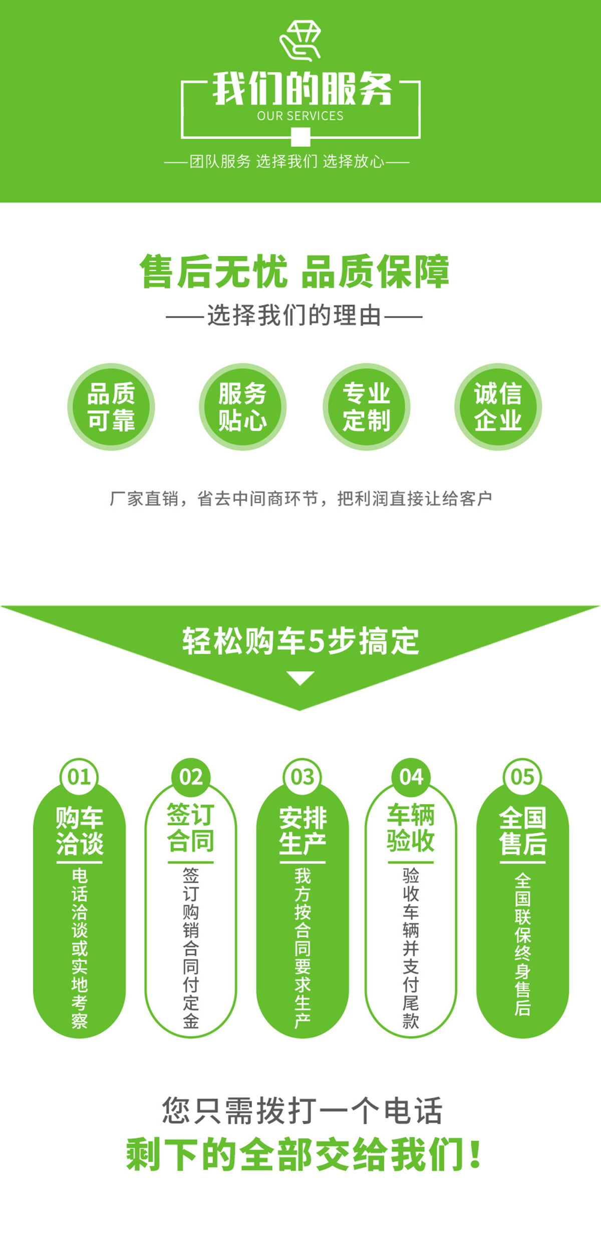 ·創(chuàng)優(yōu)質(zhì)服務(wù)企業(yè); 造用戶滿意產(chǎn)品; 樹國內(nèi)知名品牌!公司堅(jiān)持以“質(zhì)量求生存、信譽(yù)求發(fā)展、科技創(chuàng)新路、服務(wù)創(chuàng)品牌”的經(jīng)營理念,以“誠信、務(wù)實(shí)、創(chuàng)新、進(jìn)取”為企業(yè)宗旨,不斷提升自身產(chǎn)品質(zhì)量,開發(fā)適應(yīng)市場需求物美價(jià)廉的多功能專用汽車! 我們將謁誠為您提供更好、更快、更優(yōu)質(zhì)的服務(wù)!