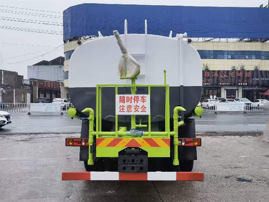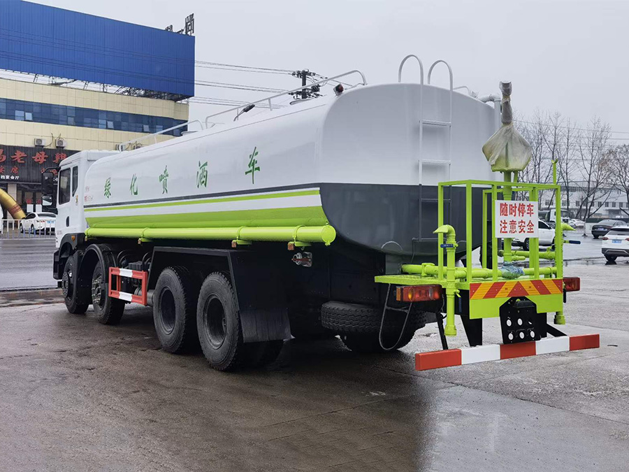 上裝配置簡要介紹:罐體采用標準Q235碳鋼制作,罐體自動焊,裝水25噸,配大功率專用灑水車,可自吸自排,前沖后灑,側噴,高位花灑,主管道加粗,大通徑球閥,直通球閥式消防接口,帶后工作平臺,沖孔平臺,帶高炮。(可選裝大平臺,可裝30米霧炮降塵)。環保,免征齊全。