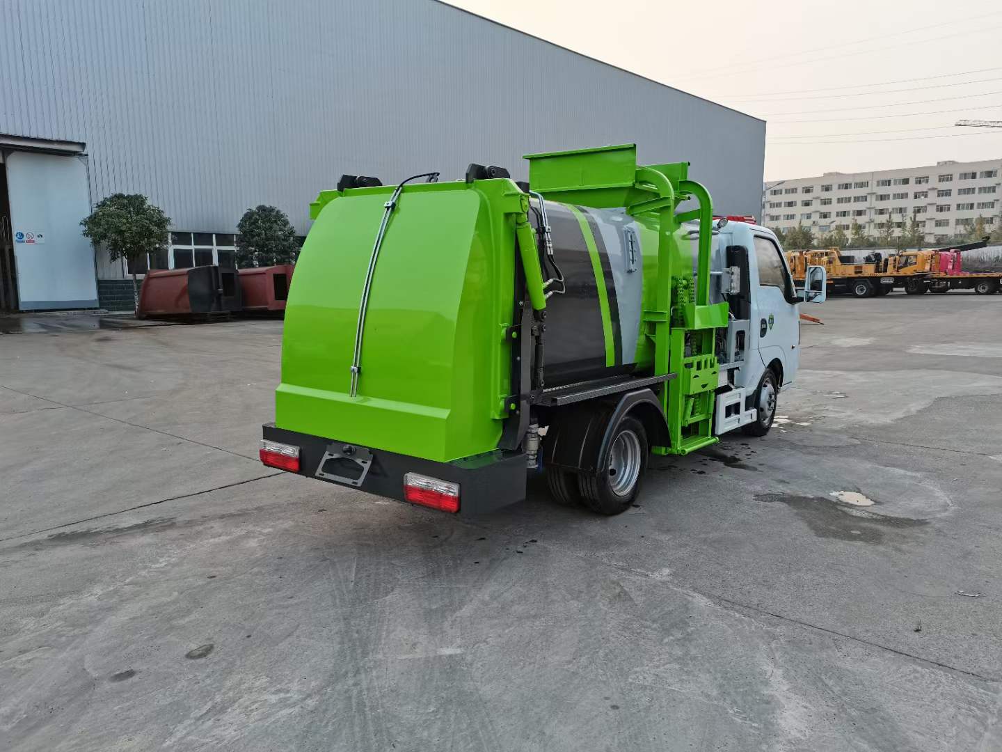 底盤配置:東風途逸(國六)軸距:2800mm,1650/單排,全柴Q23-95E60(95馬力),5檔變速箱,185R14真空輪胎-后雙輪,前后橋1.5/3。標配動力轉向,前盤制動,中控門鎖,電動門窗,定速巡航,藍牙電話,LED日間行車燈,ABS,空調,預留取力器窗口。上裝配置:箱體采用T700高強度耐厚鋼,邊2底2,容積4立方,嘉善取力器,合肥油泵;江蘇多路閥;國產液壓油缸;帶推鏟卸料功能(不帶舉升),擠壓干濕分離,尾部大梁上左右各安裝一個出口帶消防接口;液壓后蓋,后蓋帶密封條,后蓋液壓鎖緊;雙鏈條提升機;可掛120/240L標準塑料垃圾桶;駕駛室內集中電控(提升機外部手動控制);后門鎖緊與后蓋開關的操作具有防誤操作,提升機與上蓋、推鏟具有防誤操作;帶高壓清洗功能,液壓馬達,清洗泵,自回位巻盤,水槍;車身高位示廓燈/邊燈/作業照明燈。電控操作功能。可選裝遙控器操作。