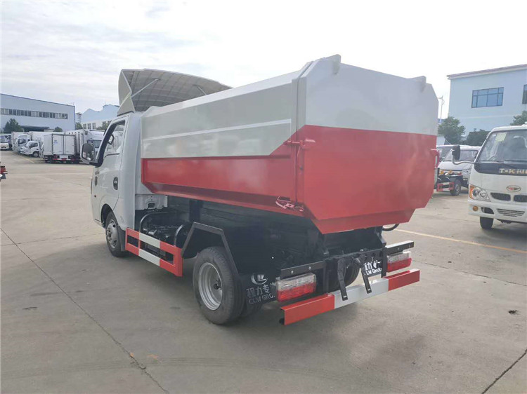 自動舉升垃圾桶倒入垃圾,提升機頂部帶機械翻蓋,箱體底部雙液壓舉升自卸,箱體后部設有擋水槽,尾部裝有橡膠密封條,防污水滴漏。